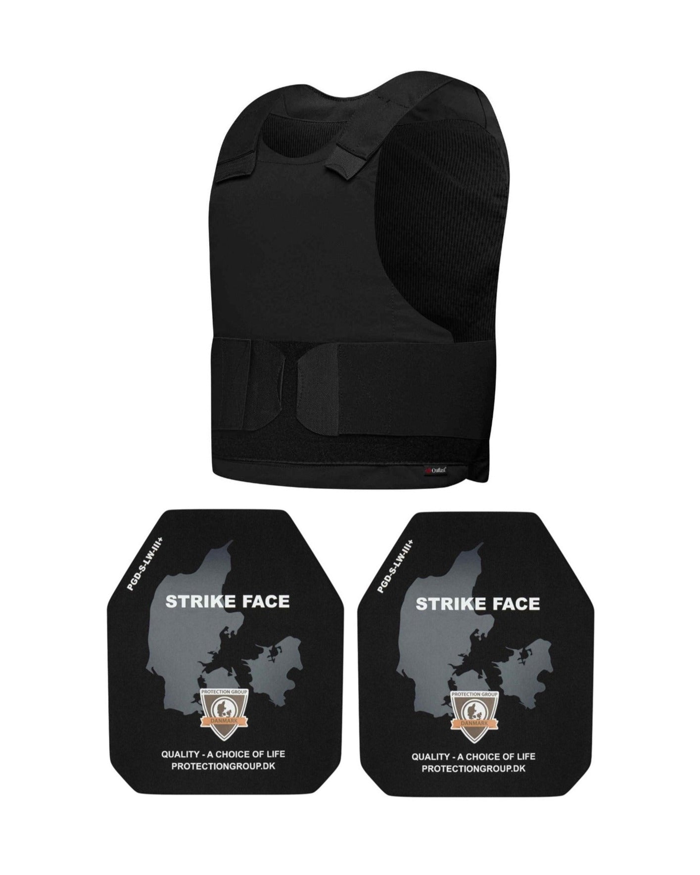 Als bescherming tegen handvuurwapen kalibers met een stalen kern en tegen het Russische 7.62x36mm MSC AK47 Kalashnikov geweer is deze discrete kogelwerende vest voorzien van twee harde superlichte kogelwerende platen NIJ III+ van 25x30 cm.