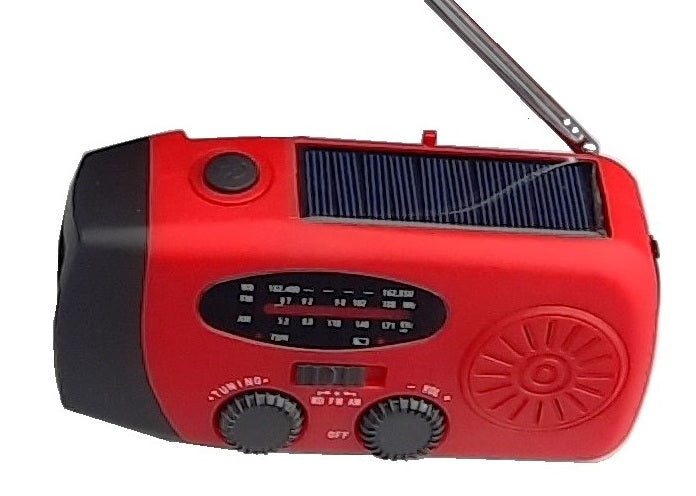 Noodradio: met solar powerbank en herlaadbare zaklamp en zwengel om op te laden.