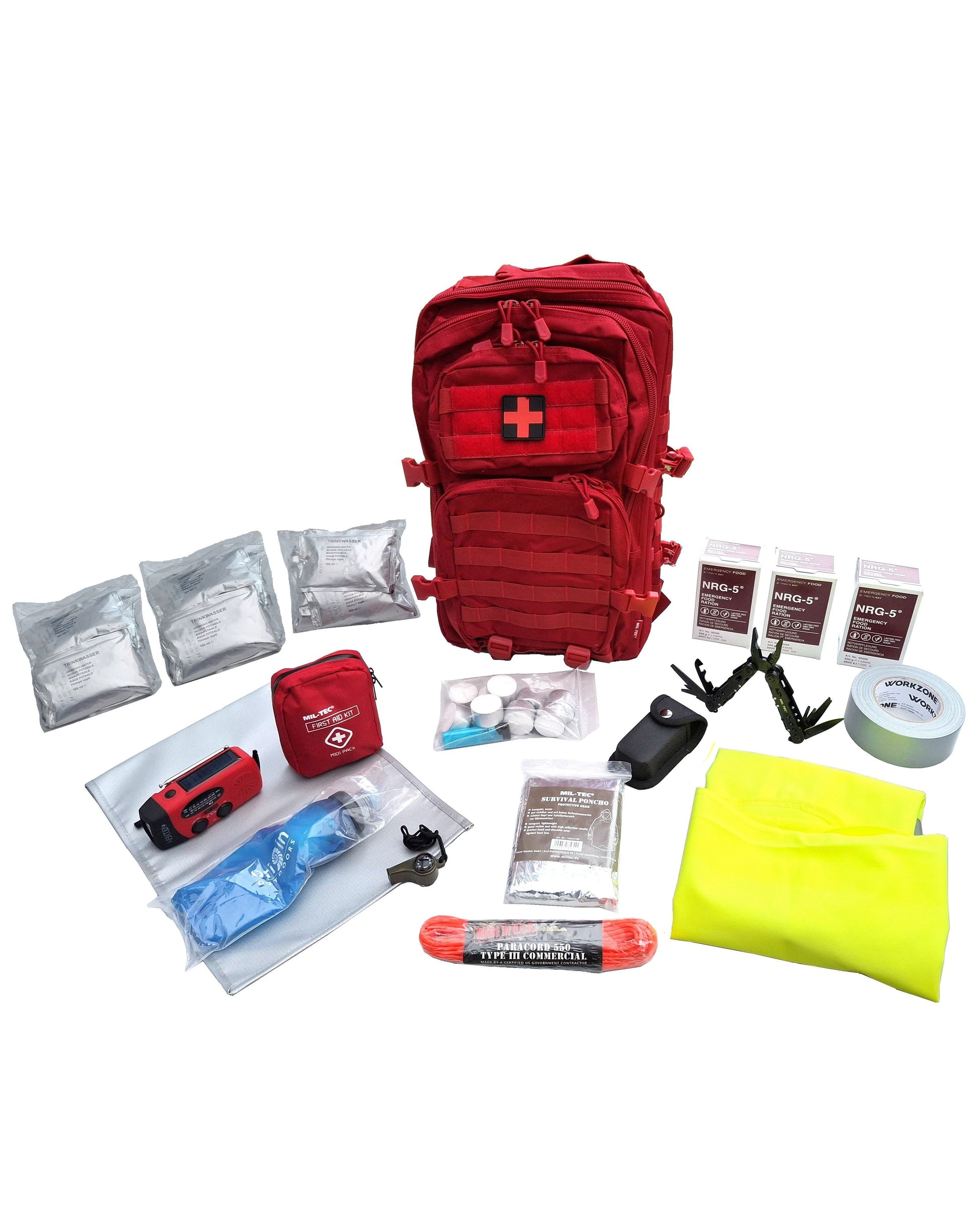 Alternatief rode rugzak noodpakket met kruis 72 uur overleven volgens Europees advies om in Vlaanderen online te kopen. Grotere noodrugzak 36L basis inhoud en zelf samenstellen. Dit noodpakket is samengesteld volgens de visie van Vlaamse lokale hulpverleners maar is als alternatief samengesteld met meer courante survival artikelen zoals een grotere rode rugzak met Molle webbing aan de buitenkant een inhoud van 36 liter waar men nog tal van extra nuttige items kan toevoegen.
