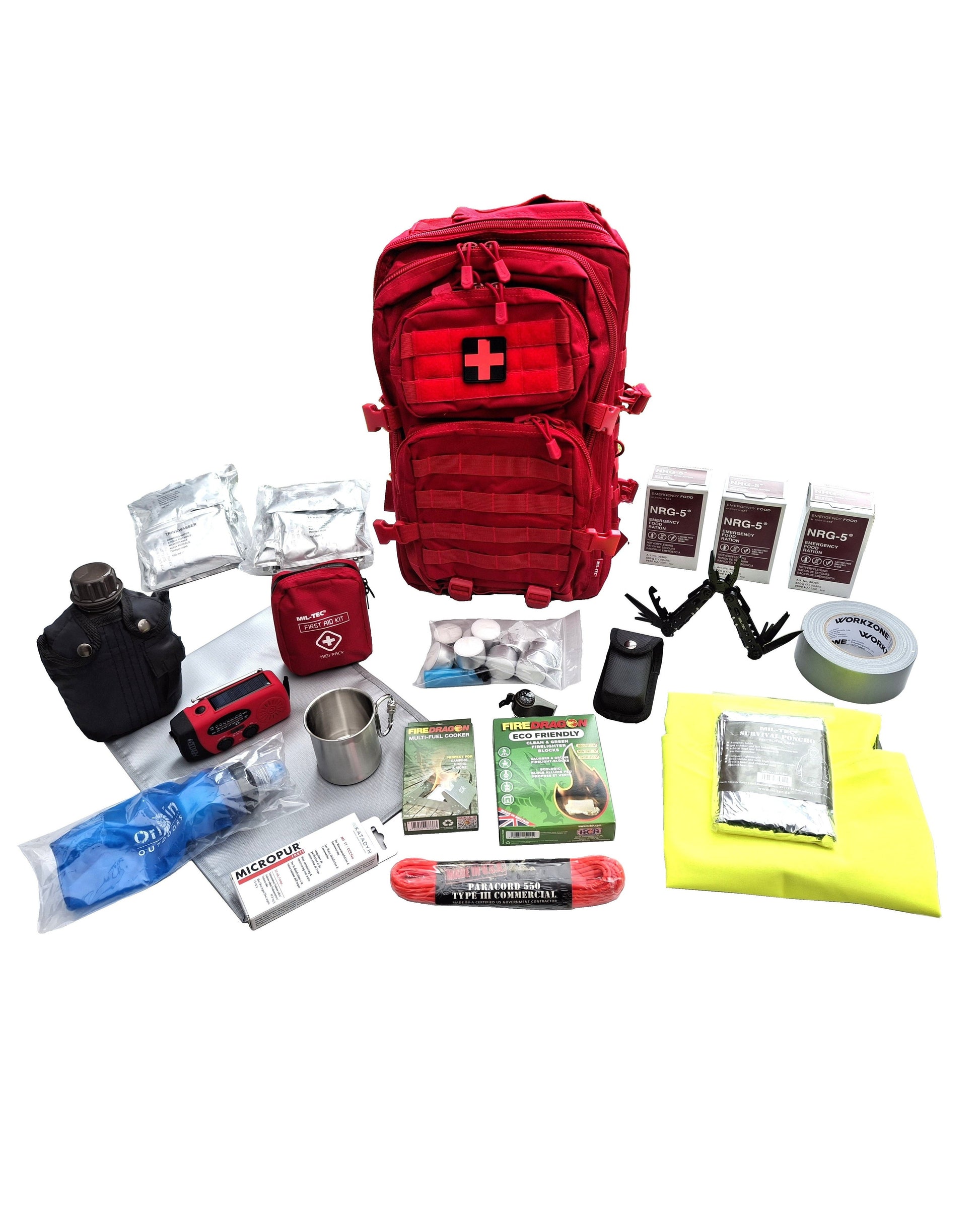 Alternatief rode noodpakket rugzak met kruis 72 uur survival in Vlaanderen kopen. Samengesteld volgens survival experts met in 36L grote noodrugzak.