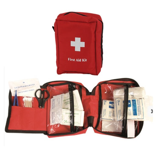 - Rood EHBO set rood Large: 1 Schaar, Wattenstaafjes, 1 Pincet, 4 alcohol doekjes, 8 pleisters, Gaasdoek, Pleister, 1 pakje met 5 kleine gaasverbanden (5 cm x 2,5 m), 1 verpakking van 5 gaasverbanden (7,5 cm x 2,5 m), 5 steriele gaasjes (7,5 x 7,5 cm), Wegwerphandschoenen,- 2 driehoekige handdoeken (kunnen als kompressen gebruikt worden), Veiligheidsspelden, Ademhalingsmasker