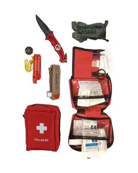 Samengestelde budget Rood EHBO set Large met CAT Tourniquet, een noodverband met spanner, een reddingsmes en een noodfluitje met als doel zichzelf te redden, geschikt voor in een noodpakket. Met deze items kan je je bevrijden uit een noodsituatie met uw reddingsmes, kan je een zware verwonding behandelen met het noodverband, kan je een aderlijke bloeding stoppen met een CAT-Tourniquet en kan je nog om hulp fluiten als je niet meer kan spreken.