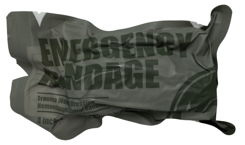 Noodverband met spanner: Om een open wonde aan arm of been dicht te drukken zodat er geen bloedverlies meer is.