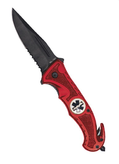Reddingsmes rood: Lemmet met gedeeltelijk gekartelde snede om touwen door te snijden.