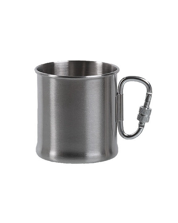 Roestvrijstalen mok 250ml met karabijnhaak is een stevige rvs drinkbeker of kom kan gebruikt worden om iets op te warmen boven een vuurtje.