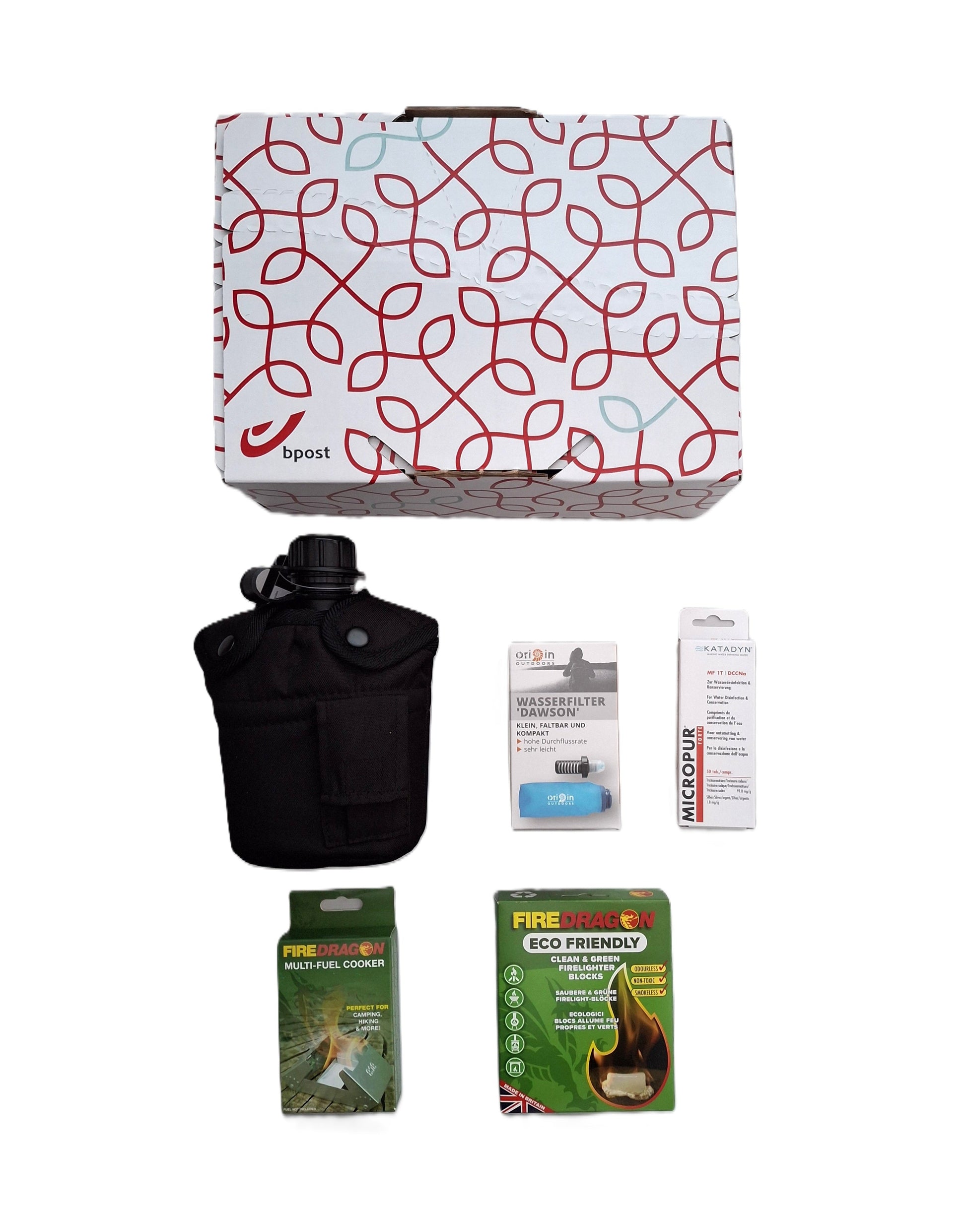 Water zuivering opslag en koken noodpakket cadeau om extra drinkbaar water te maken onderweg. Bevat een vledfles met beker, Origin waterfilter, waterzuiveringstabletten, een kooksetje en brandstof om wat water te koken.