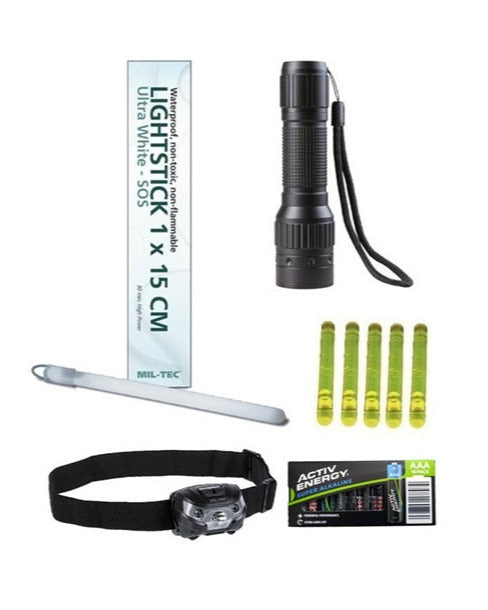 Set lampjes voor noodpakket bestaande uit 1 zaklamp met 3AAA batterijen 350 Lumen , 1 hoofdlampje met 3AAA batterijen 200 Lumen, 5 Ultra wit noodlicht staafjes 15cm en 5 stuks MIMI lichtstaafjes 4cm. 20 stuks AAA Alkaline batterijen. Samen vormen ze een set lichtjes en lampjes die u kan verdelen in uw noodrugzak en/of noodriem.