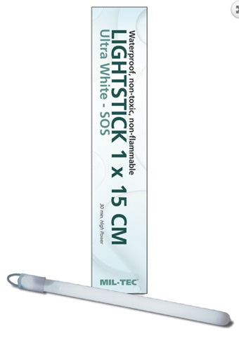 · 5 Ultra wit noodlicht staafjes 15cm: 30 minuten extreem helder licht om noodsignaal te geven. Lichtbron zonder elektriciteit. Brand tot max. 120 minuten. Afmeting 10x150 mm. Het licht kan geactiveerd worden door de punt over te kraken in de plooi en schudden.