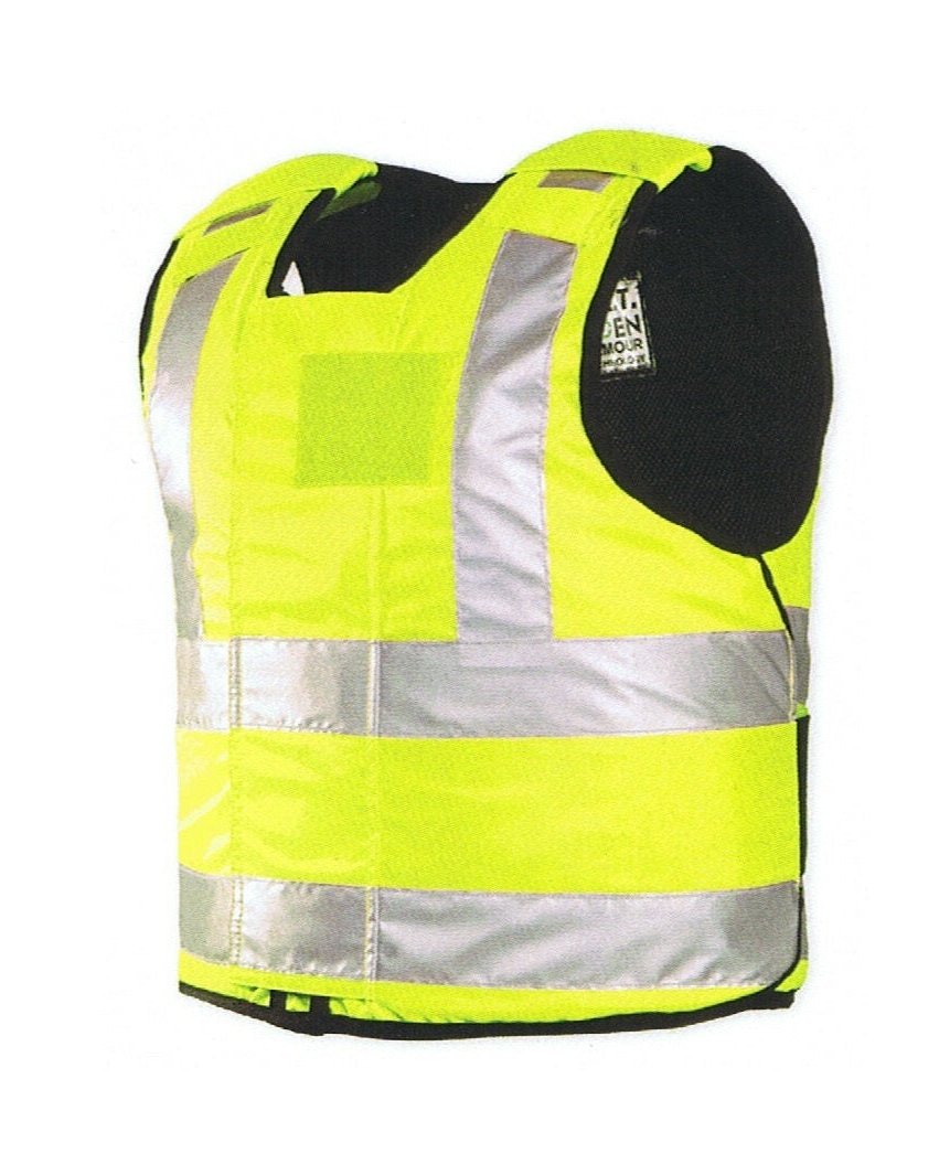 Anti steekpartij mesaanval Hi Vis KR1-SP1 vest geel steekwerend vest high visibility fluo anti steek of reflecterend veiligheidsvest. Hoog zichtbare steekvest voor hulpdiensten of security personeel met rits in het midden. Grote patch achter en kleine patch vooraan.
