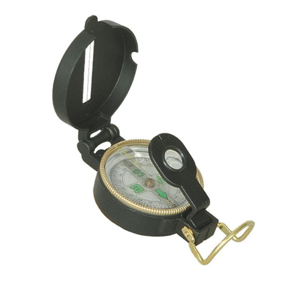 Scout kompas met vloeistofdemping, vergrootglas in de zoeker en draaibare schaalverdeling. Stevig en betrouwbaar die men kan opbergen in een rugzak of survival riem.
