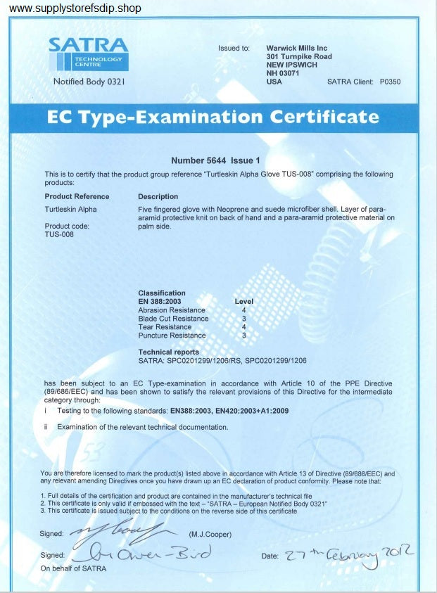 EN 388 certificaat Turtleskin Alpha handschoenen pdf