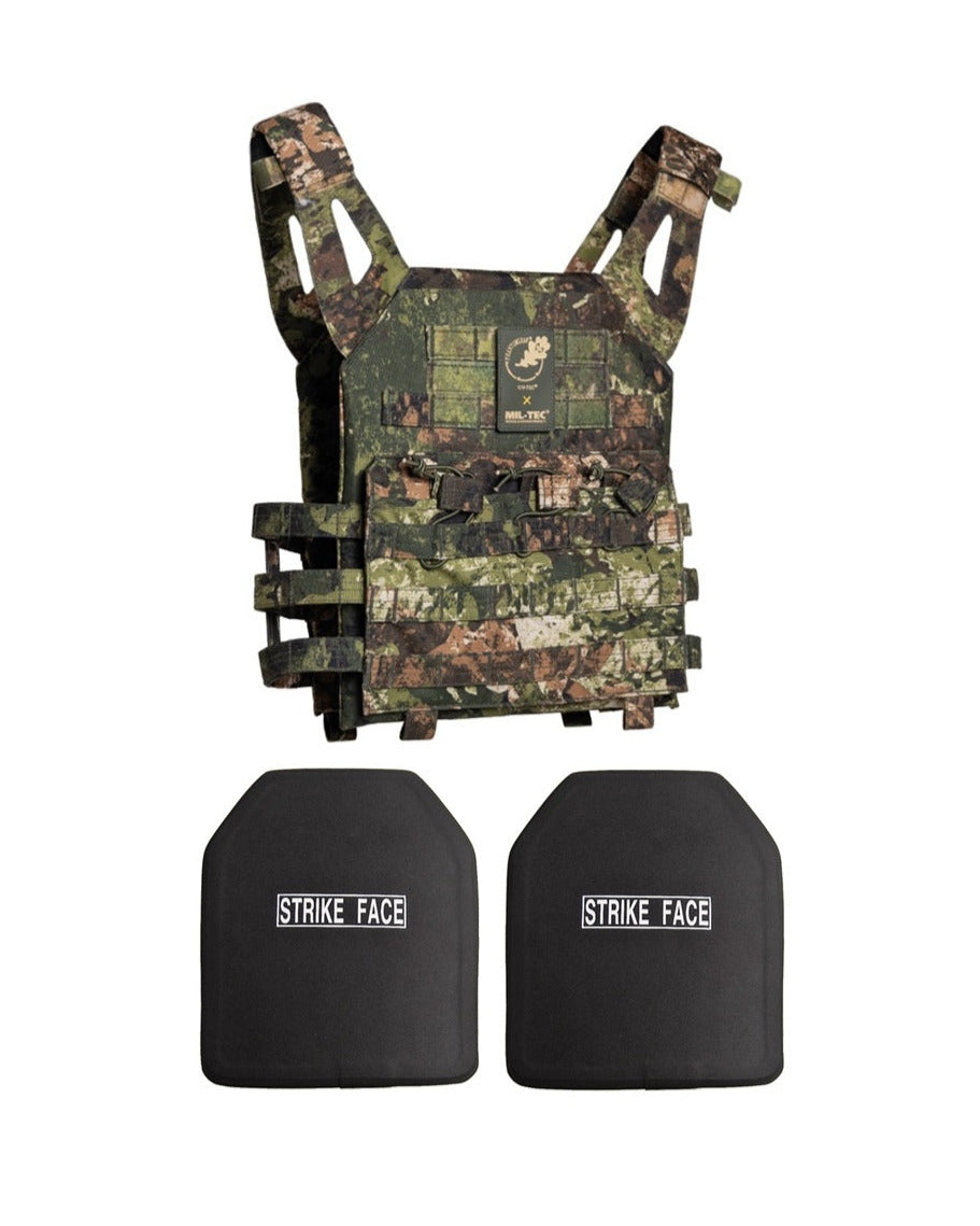 Phantomleaf WASP Z3A plate carrier Gen.II met twee harde kogelwerende platen klasse 4 SA Stand Alone bos camo voor jager militair of survival als bescherming tegen oorlogsgeweren zoals AK47 Kalasjnikov, M15, M4, fal en SCAR voor het gebruik in gebieden met een hoge vegetatie, zoals loof- en naaldbossen, maar ook tropische jungle, met een hoge aanpasbaarheid voor grensgebieden tot lage groei, zoals struikgewas, landbouwgrond of graszones. (ongeveer vergelijkbaar met Woodland camouflage)