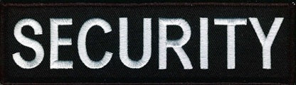 Geborduurde SECURITY patch of badge in zwart met witte letters en met afmetingen 3.8x13.5cm en velcro haakjes aan de achterkant. Heeft op de achterzijden een vlak van klittenband haakjes waarmee u deze op elk oppervlakte kunt plakken waar klittenband zich aan vastklemt.