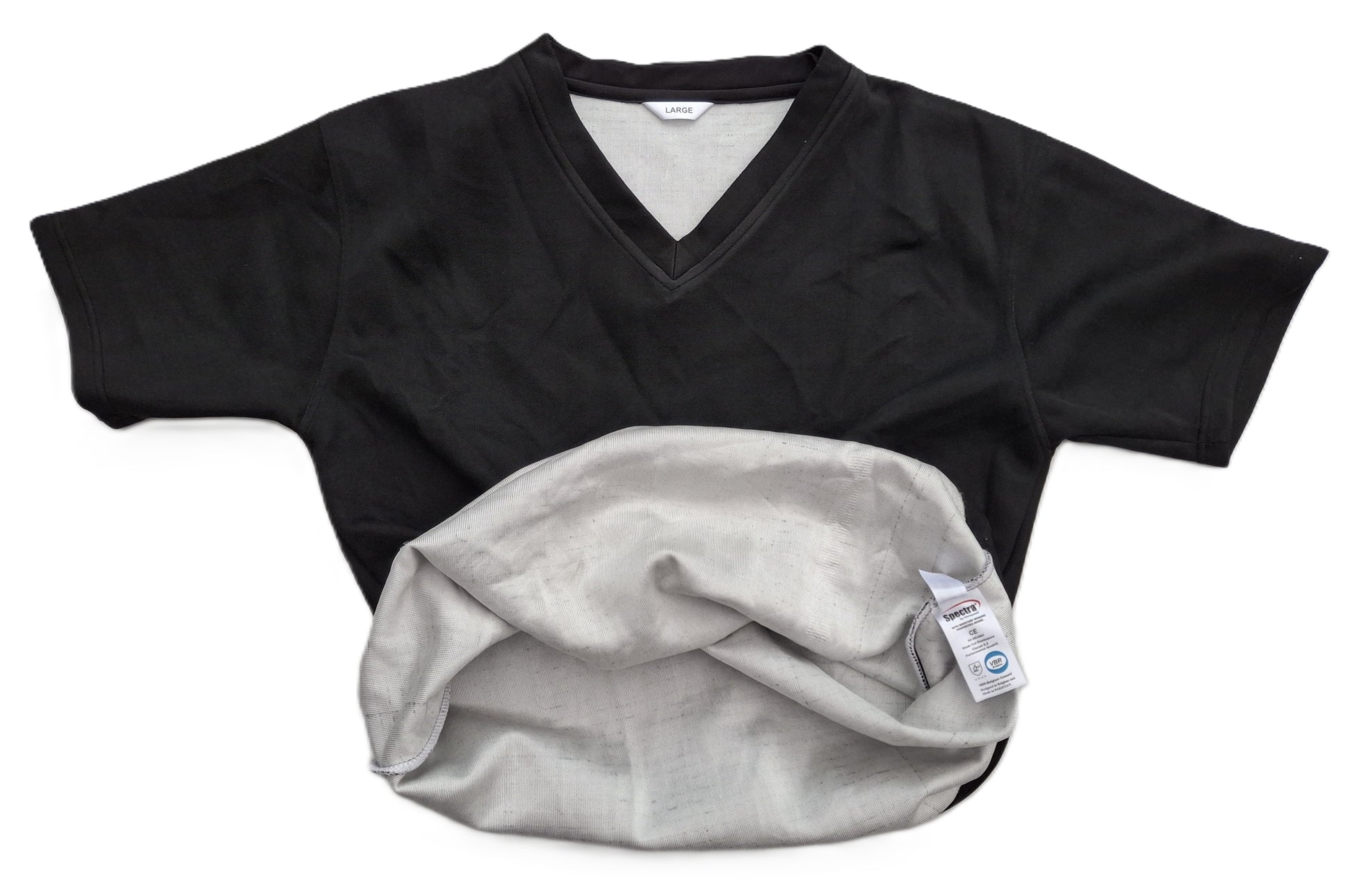 De snijwerende bescherming zwarte Spectra zit over het gehele oppervlak van het T-shirt (borst, schouders en korte mouwen). De buitenkant is zwart, de zachte binnenkant is een witte coolmax die zachte en fris aanvoelt.