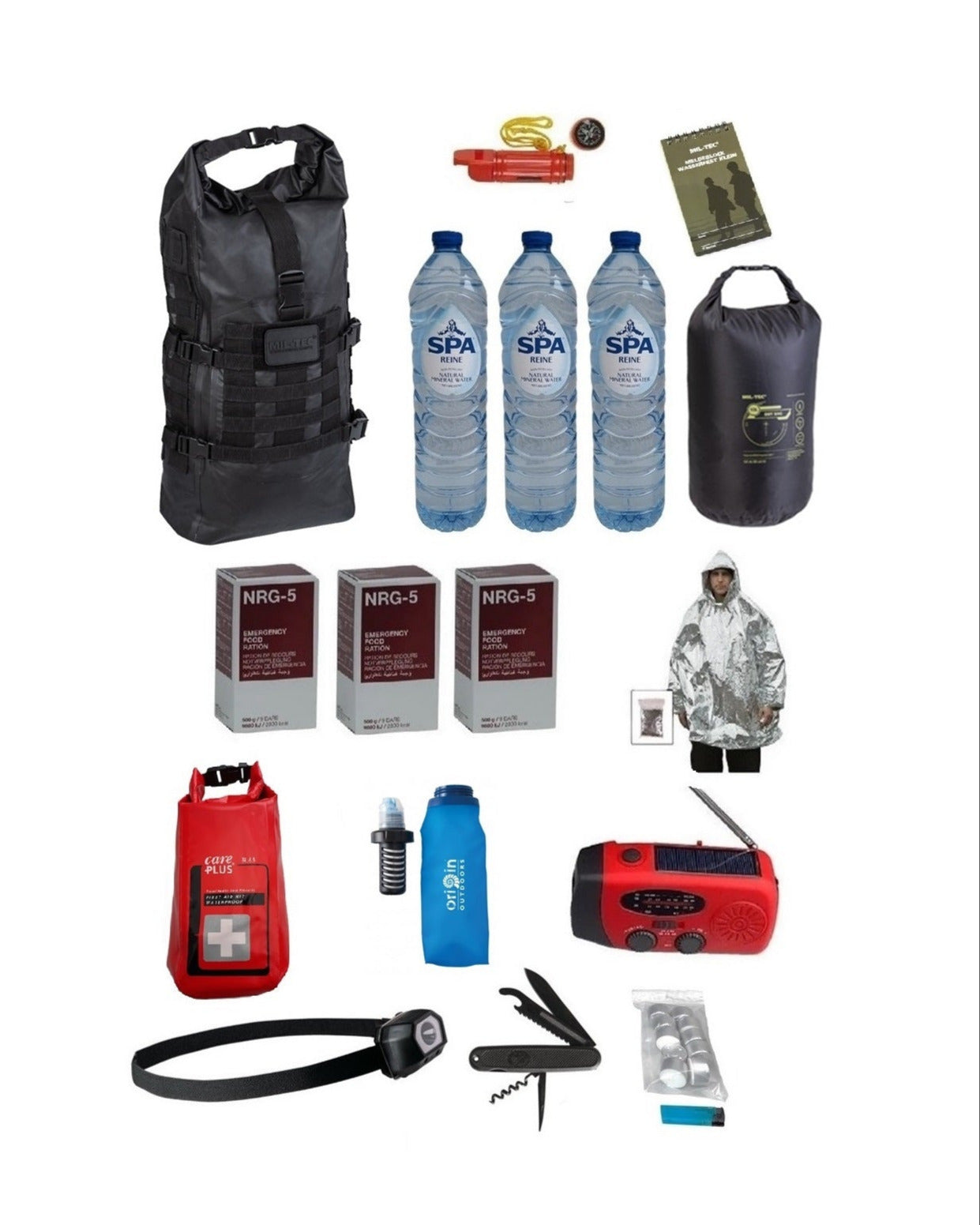 Waterdicht noodpakket overstroming basis bevat het minimum om te overleven bij een overstroming of tsunami en kan als drijvende reddingsboei gebruikt worden.