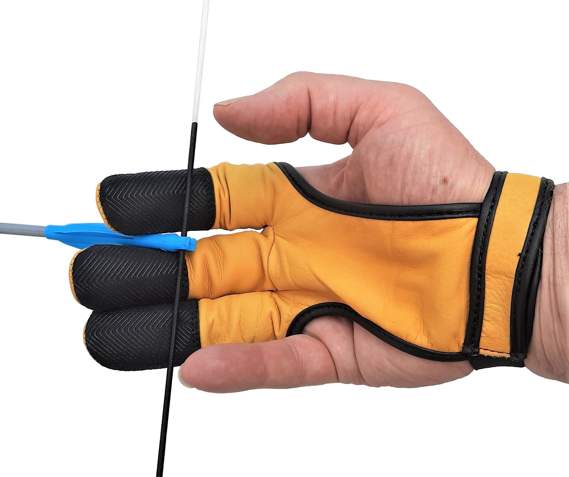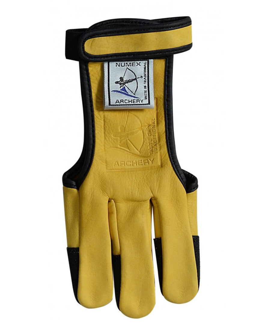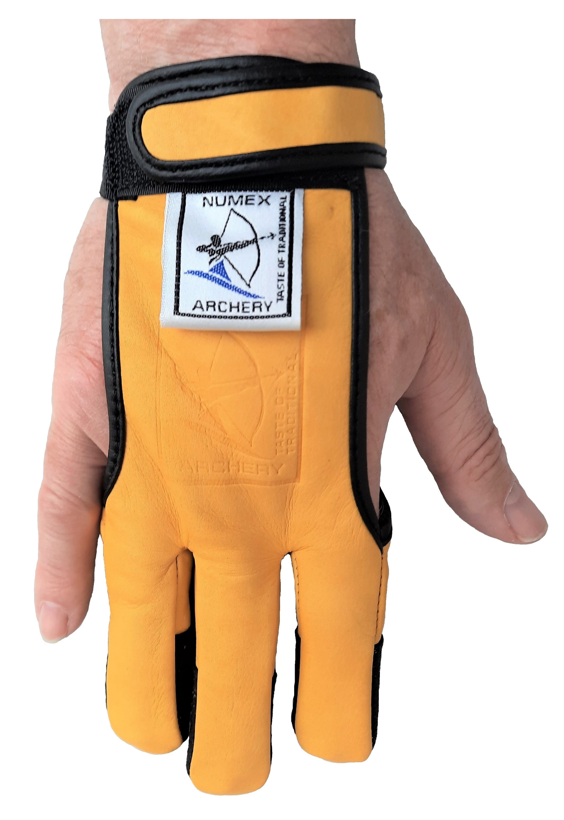 Gele handschoenen handboog traditioneel boogschieten silicone anti-slip versterkte vingertoppen. Goede schiethandschoen van de beste kwaliteit zacht rundleer met volle palm en met gripvaste silicone versterkte vingertoppen. Goed gevoel met de pees en optimale bescherming zelfs bij het gebruik van een zware boog. De schiethandschoen wordt stevig op zijn plaats gehouden door een regelbare polsband met klittenband sluiting. Fabrikant Numex-Archery.