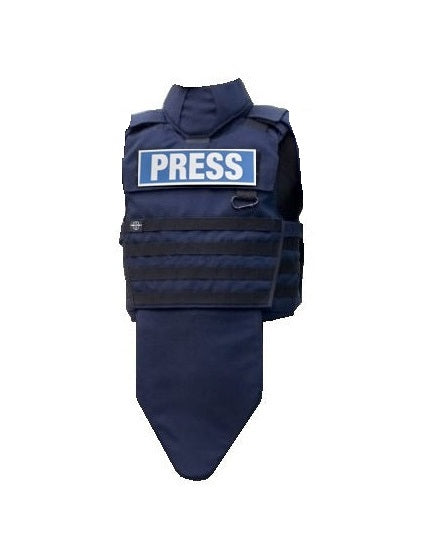 Leopard basis PRESS kogelvrij vest zachte 3A MT-PRO GEN7 kogelwerend Molle vest Engarde® met nek-, schouder en liesbescherming. Marineblauw kleur geschikt voor journalisten met voor en achter een PRESS patch. De zachte kogelwerende vest zijn -3A NIJ-0101.06 MT-PRO GEN7 van Engarde® en is voorzien is van twee zakken (vooraan en achteraan) voor harde kogelwerende platen. De nek-, schouder- en liesbescherming bieden extra bescherming aan het lichaam tegen kogels of granaatscherven.