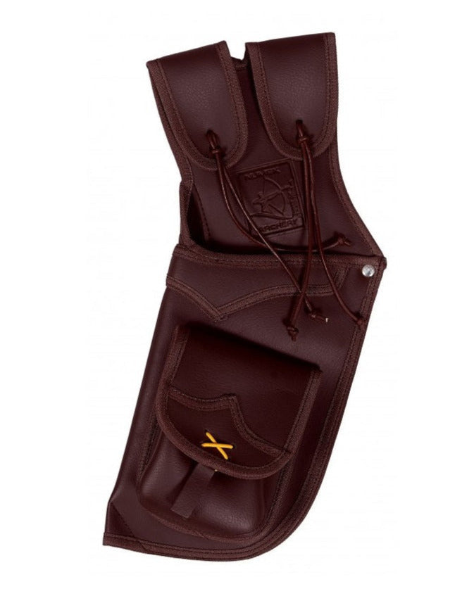 LH pijlenkoker traditionele heup field quiver donker bruin kunstleer online kopen. Traditionele linkerhand LH Field Quiver heup pijlenkoker van Numex Archery voor boogschieten gemaakt uit dik en stijf donkerbruin kunstleer en voorzien van een opbergvakje aan de voorkant. Heup pijlentas om aan een riem te bevestigen waarbij de pijlen naar achteren wijzen.