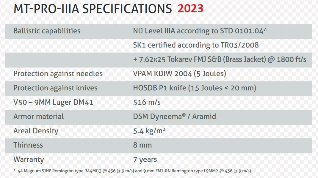 Door het Dyneema-weefsels van DSM te integreren, biedt het MT PRO-paneel zowel superieure kogelwerende prestaties als bescherming tegen messen.
