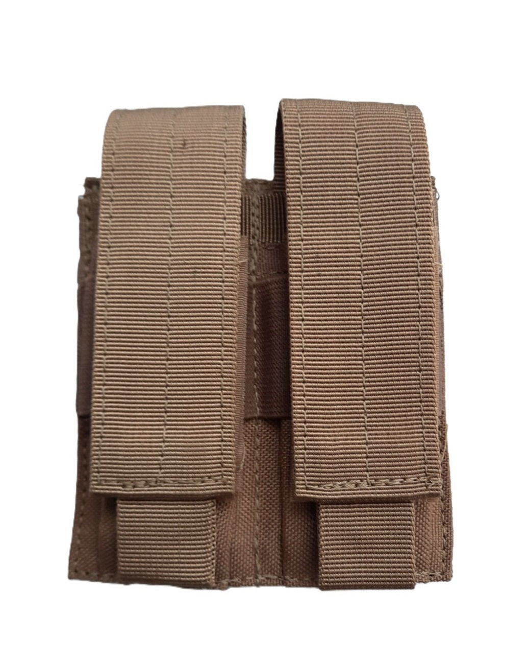 Condor dubbele magazijntassen in coyote kleur met een in hoogte verstelbare Velcro afdekking en laterale rubberen compressie band.