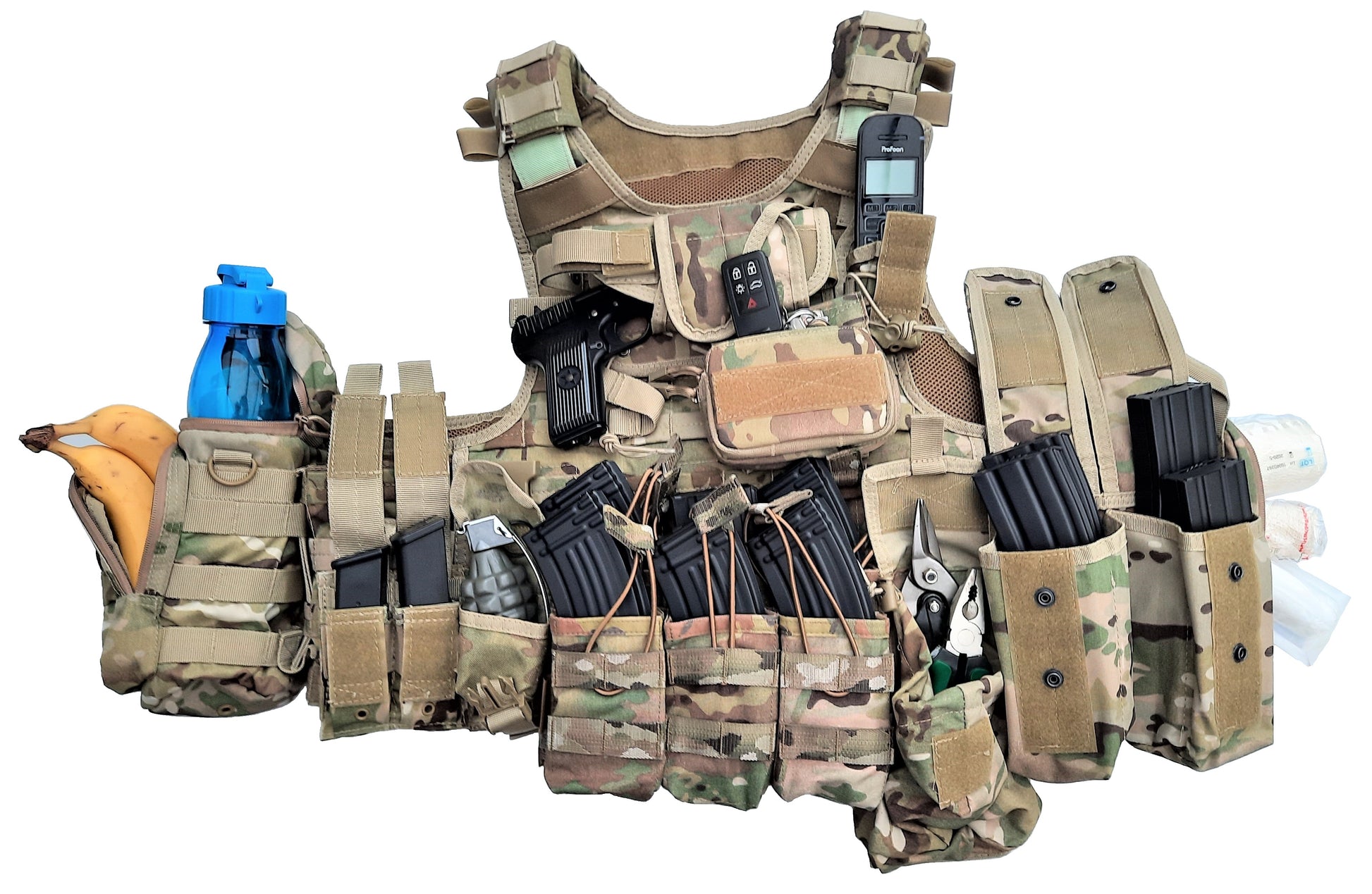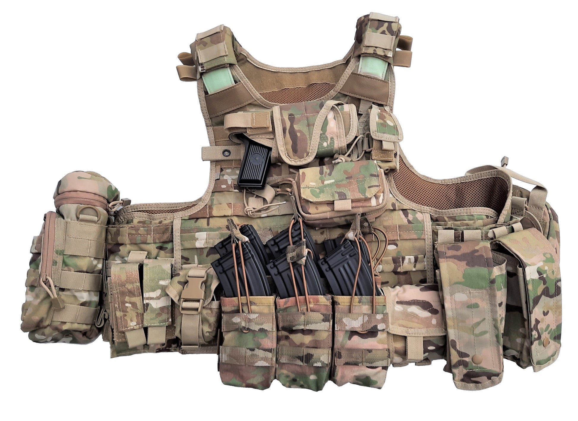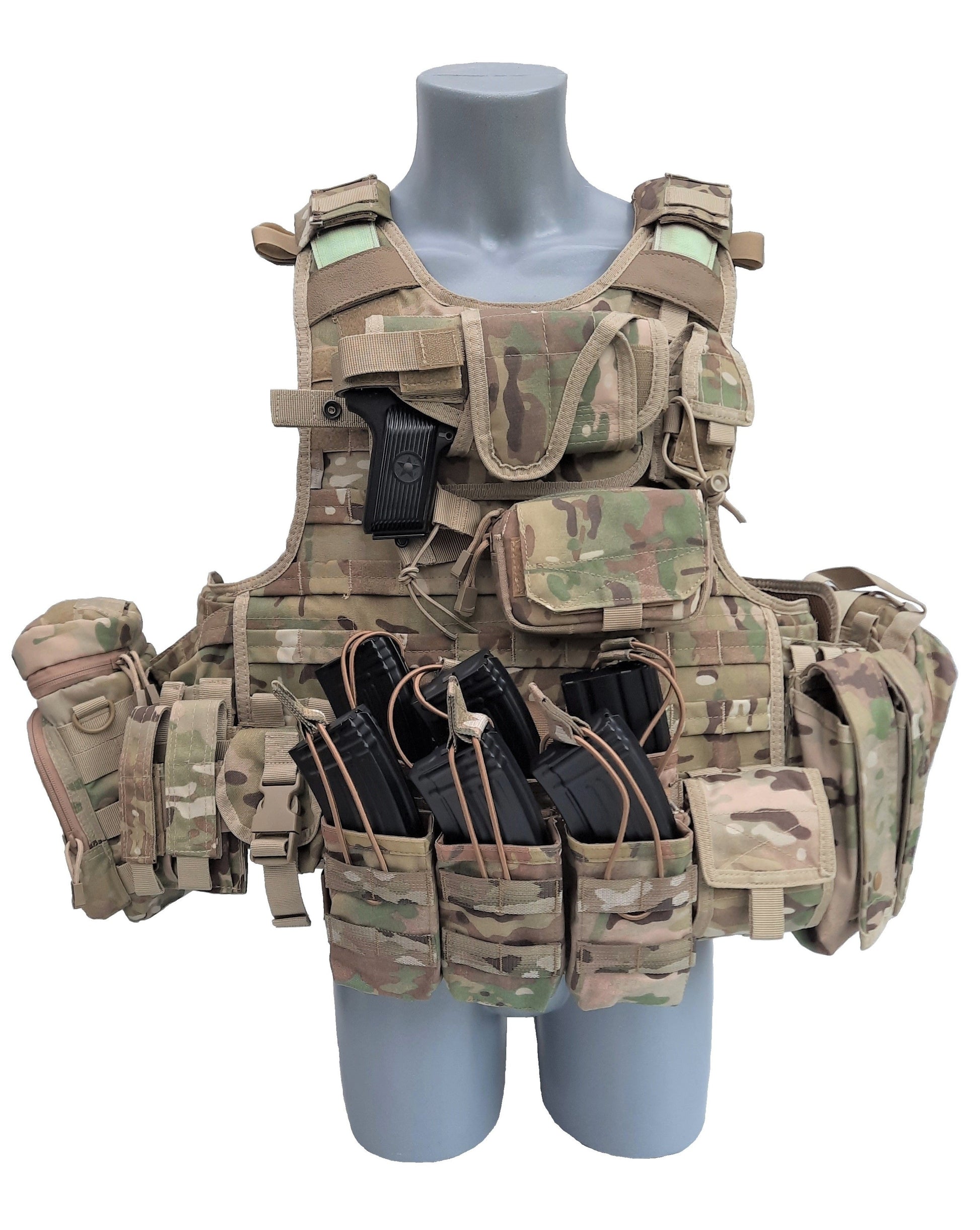 QPC Multicam Klasse 4 met verschillende tasjes reeds gemonteerd. Werd speciaal samengesteld met grote opberging voor AK magazijnen goed voor in de front linie.  (showroom model)