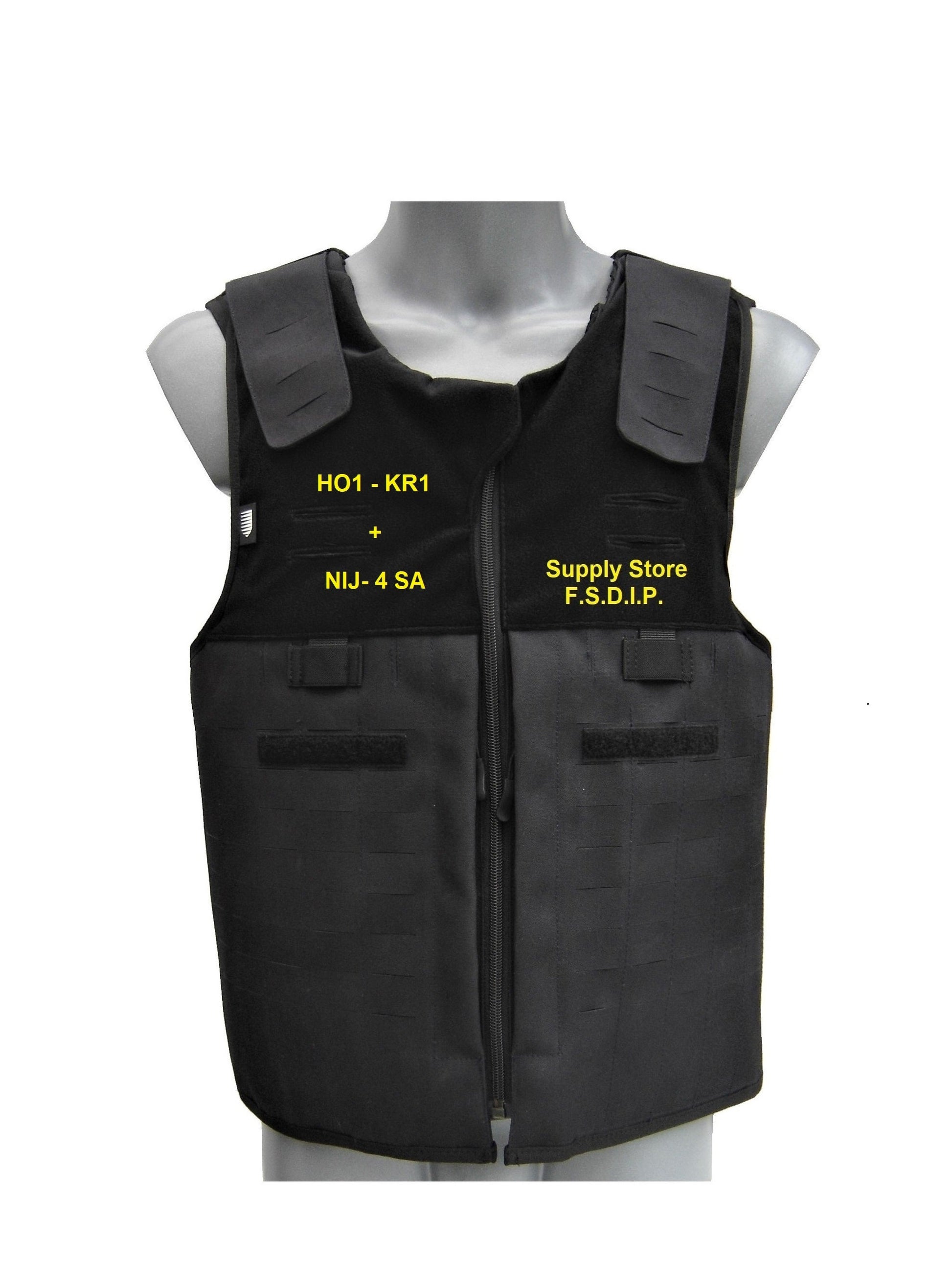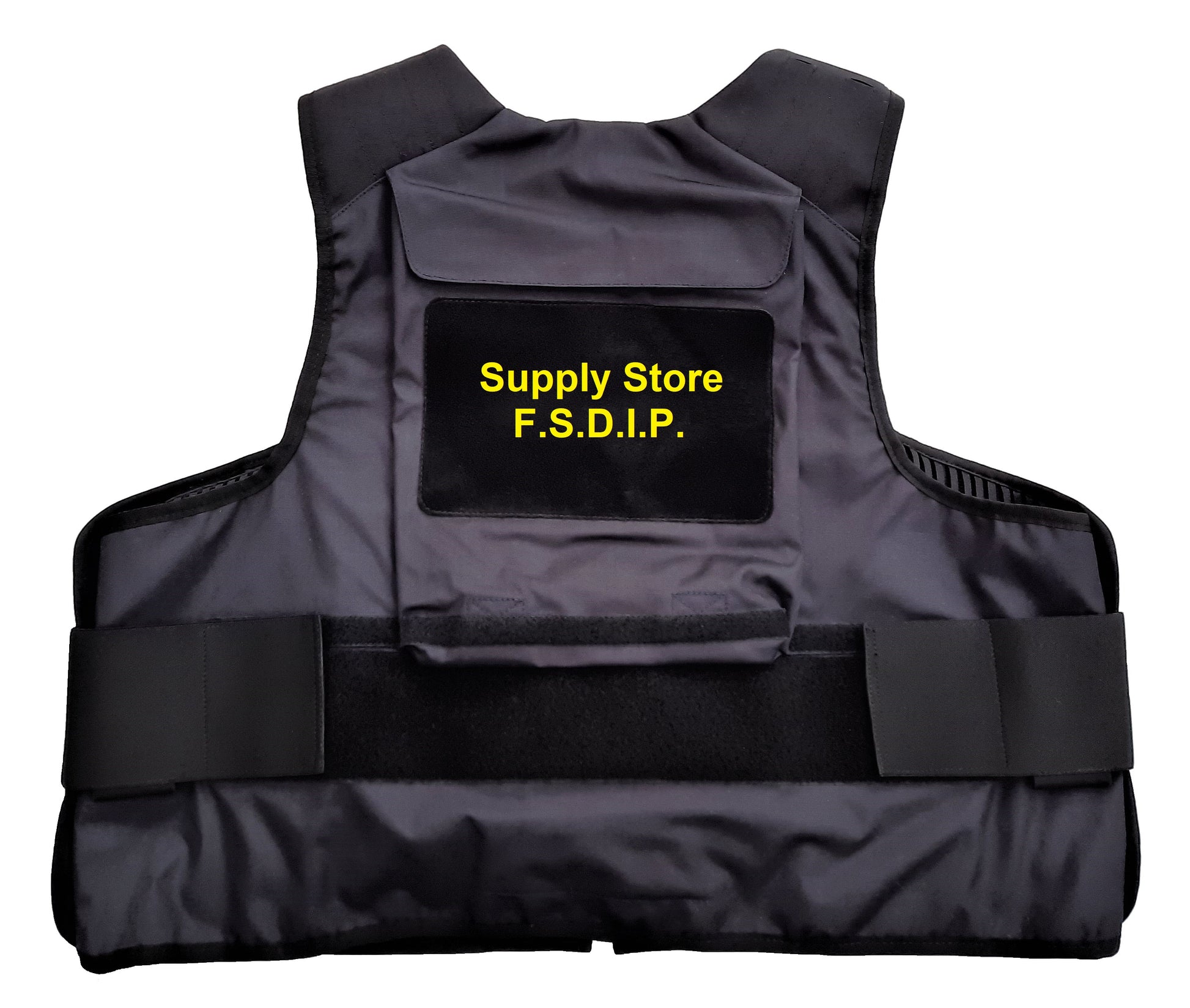 Mogelijkheid om harde platen in het vest te plaatsen bovenop de soepele bescherming. Langs achteren een traditionele plaatzak. Langs voor een speciale zak waarbij de plaat gemakkelijk kan geplaatst of verwijderd worden in een auto.