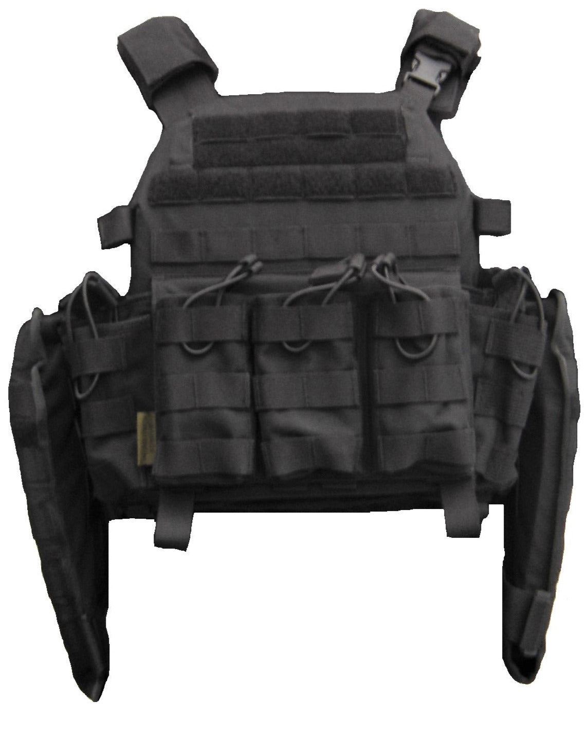 Bevat een stevige zwarte plate carrier met verschillende tasjes en twee extra grote zijtassen voor harde kogelwerende platen.