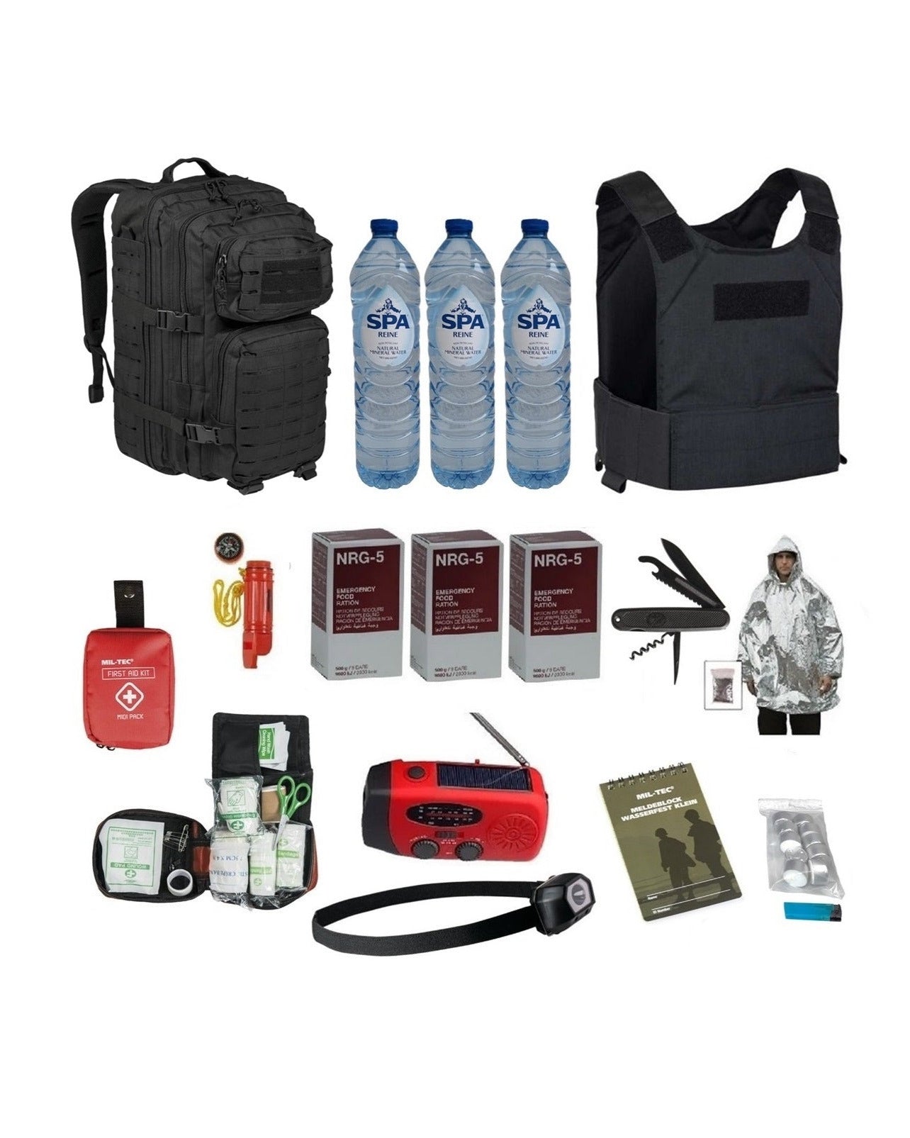 Noodpakket 72 uur discrete plate carrier klasse 4 zwart anti schietpartij Brussel met kogelvrij vest tegen oorlogswapens om de weerbaarheid van de burgers in stad oorlog te vergroten. Bevat een noodrugzak om 72 uur te overleven en een discrete plate carrier met twee harde kogelwerende platen klasse 4 tegen Kalasjnikov of M16 geweren.