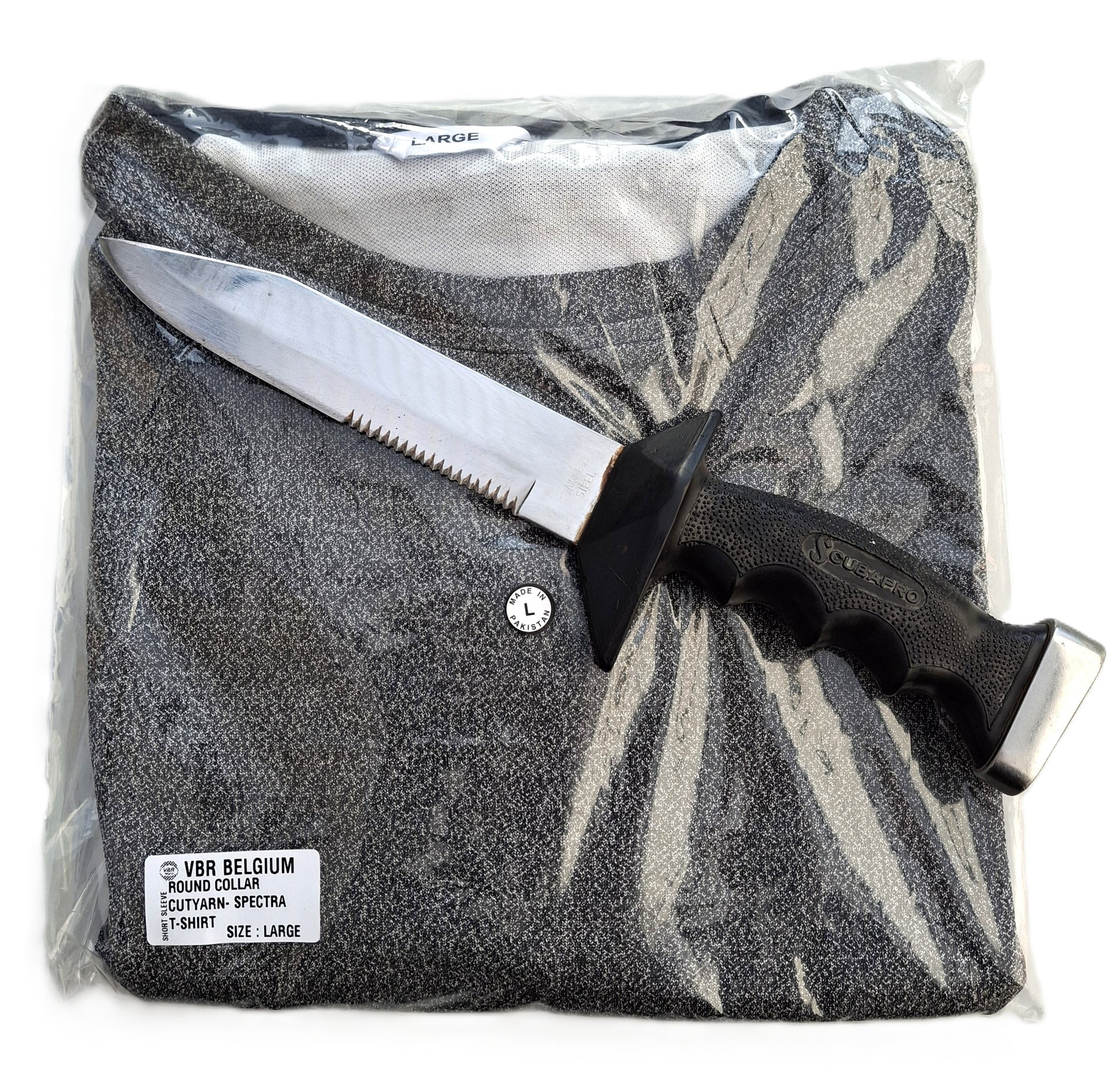 Deze snijwerende, steekwerende en scherfwerende T-shirt of onderhemd is een ernstige en praktische bescherming tegen snijwonden veroorzaakt door een aanvallen met een cuttermes, zakmes of glasscherf. Is steekwerend tegen lichte zakmessen maar niet steekvrij tegen zware dolken. Kan een ernstige verwonding bij een steekpartij verhinderen of de diepte van de wonde aanzienlijk beperken.