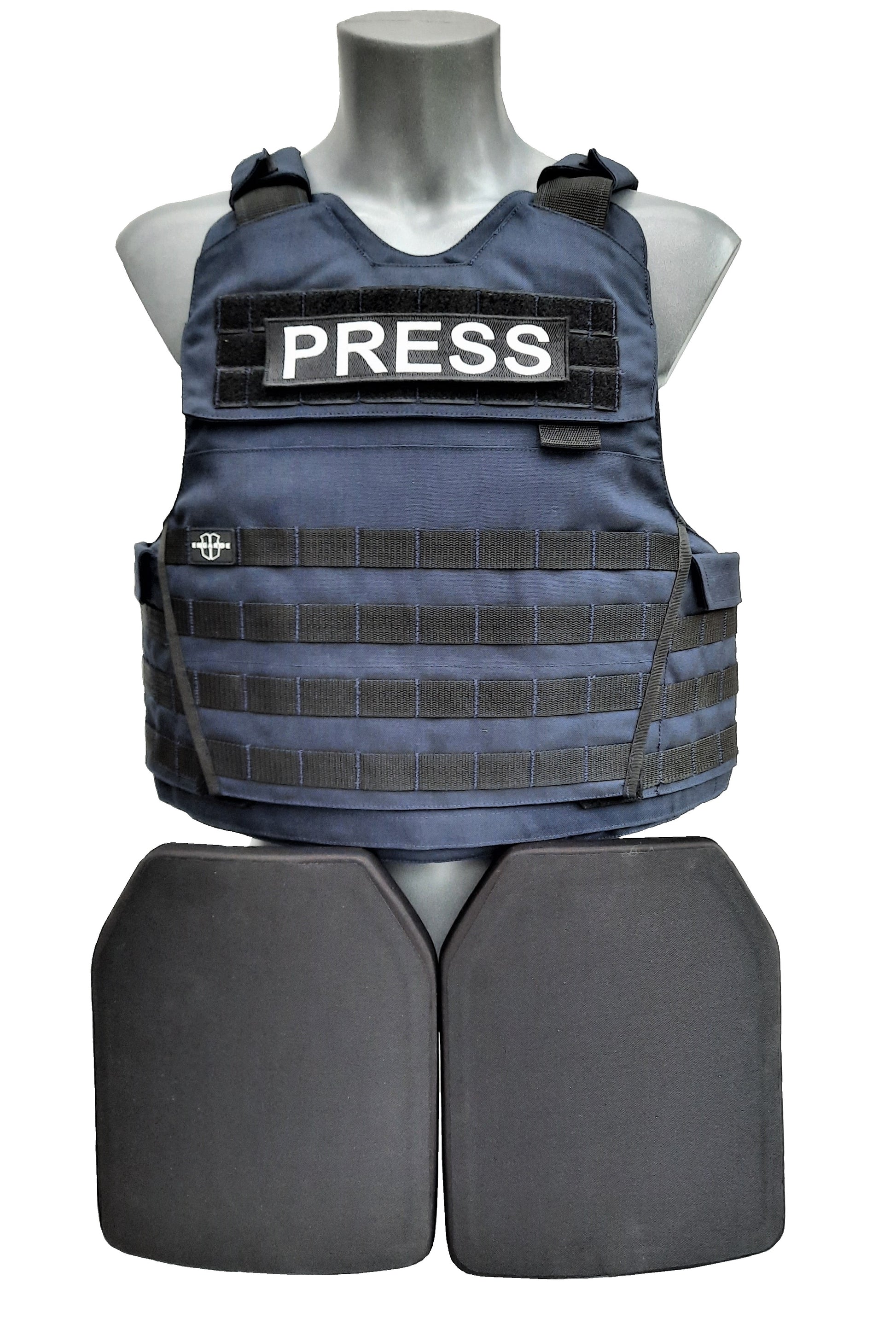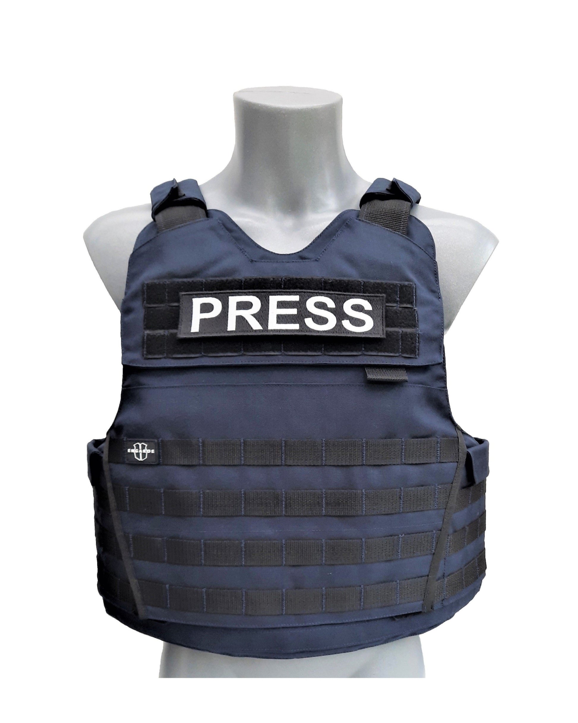 Leopard basis PRESS kogelvrij vest klasse 4 IWC (In Conjunction With) zachte 3A MT-PRO GEN7 en SK1 kogelwerend Molle vest Engarde® zonder de extra bescherming. Marineblauw kleur geschikt voor journalisten met voor en achter een PRESS patch. De zachte kogelwerende vest zijn NIJ-3A (06) MT-PRO GEN7 van Engarde® en is voorzien is van twee zakken (vooraan en achteraan) waar twee harde kogelwerende NIJ-4 (0101.04) ICW in en twee zakken (zonder de) zijplaten. Geschikt voor dames en voor heren. Goed aanpasbaar in hoogte en in breedte. Gelijkaardige vest veel te zien bij journalisten in Oekraïne. Maten van XS tot 3XL. (Het blauwe kleur wordt bij sommige douane in conflict gebieden geassocieerd met journalisten of burgers die niet deel nemen aan de gevechtsactiviteiten).