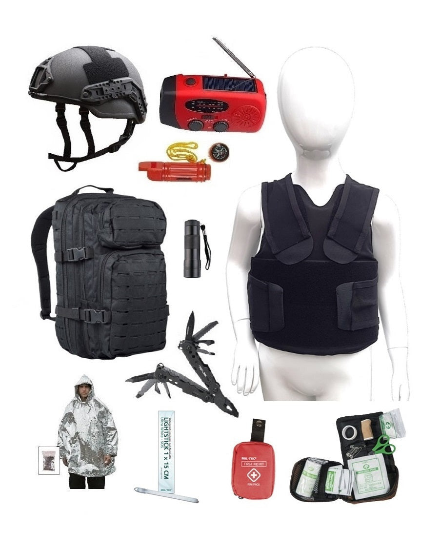 Het noodpakket weerbaarheid voor kinderen 3a is geen speelgoed maar bestaat uit een echte kogel- en scherfwerende vest 3a maat XSmall of Small, een kogelwerende helm maat Medium en een noodpakket small met enkele noodzakelijke items die nuttige kunnen zijn voor het overleven van een kind in een noodsituatie. De set kan aangevuld worden met wat speelgoed, voedsel en drank voor kinderen.