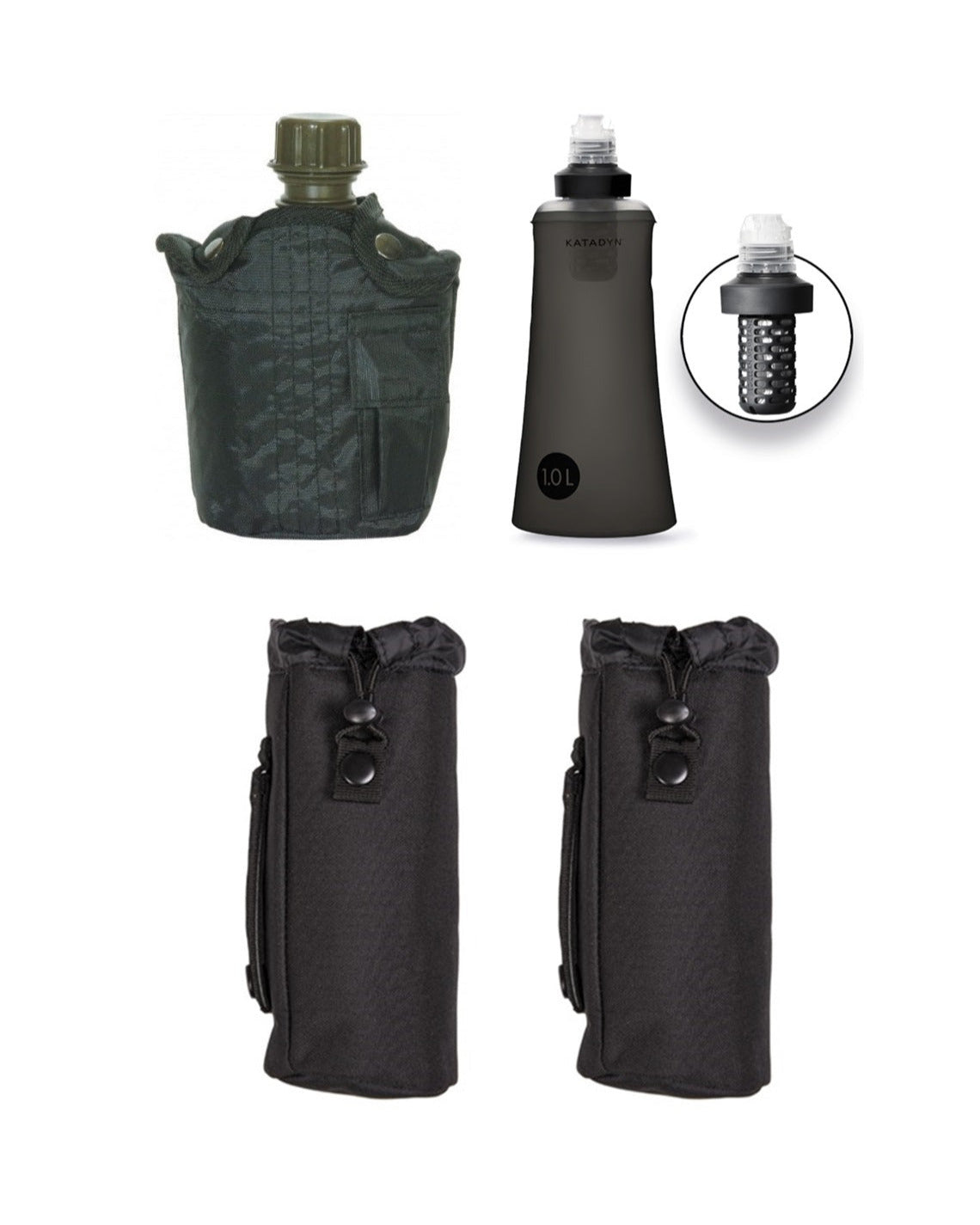 Waterfilter, drinkbus en Molle fleshouders voor noodpakket uitbreiding. Met de waterfilter kan je water snel filteren van bacteriën, parasieten en bezinksel. Stevige drinkbus om water te scheppen en twee extra fleshouders die aan de zijkant van je Molle rugzak kunnen bevestigd worden. Met deze items kan je drinkwater capaciteit van je noodpakket aanzienlijk uitbreiden om een noodsituatie te overleven.