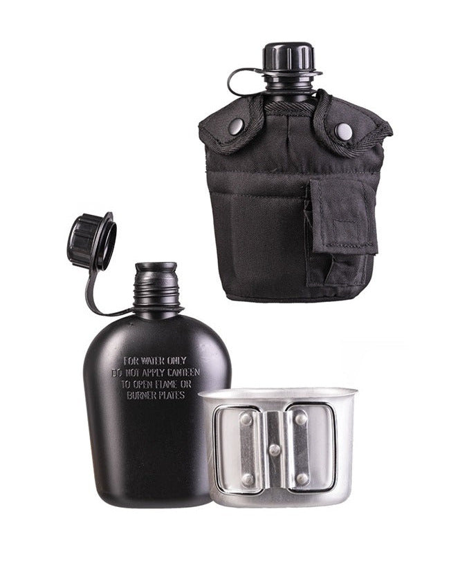 Kunststof veldfles zwart PVC 900ml met aluminium beker en zwarte hoes met zakje om waterzuiveringstabletten in op te bergen. Deze set is een kunststof replica van de klassieke Amerikaanse Leger veldfles of drinkbus met zwarte drinkbushoes. De drinkbushoes met drukknoop heeft een klein opgestikt zakje met klittenbandsluiting en ALICE bevestigingsclips aan de achterkant.